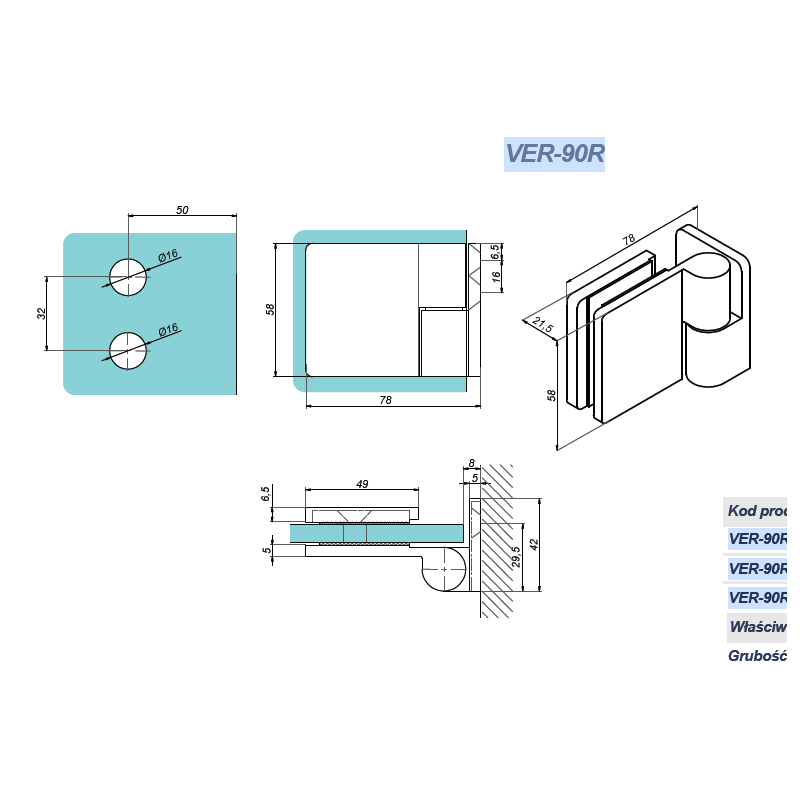 Robustný, precízne vyrobený záves určený na montáž sklenených dverí do sprchových kútov, ktorý spája sklo s stenovým prvkom pod uhlom 90°. Je vybavený mechanizmom na zdvíhanie dverí pri otváraní, ktorý zabezpečuje plynulý pohyb, minimalizuje opotrebenie tesnení a uľahčuje zatváranie.